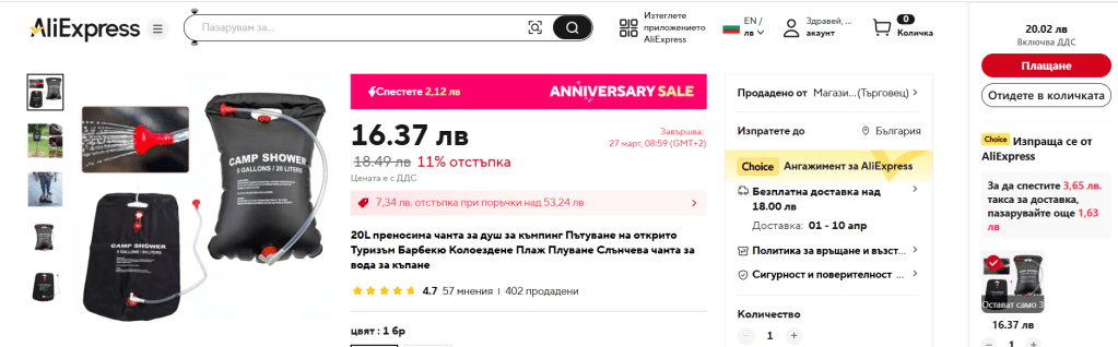 Тук идва и основния проблем с продуктите от АлиЕкспрес, а именно дългата доставка. Ако искаме този душ за лятната ни почивка в планината, ще го получим чак на есен.