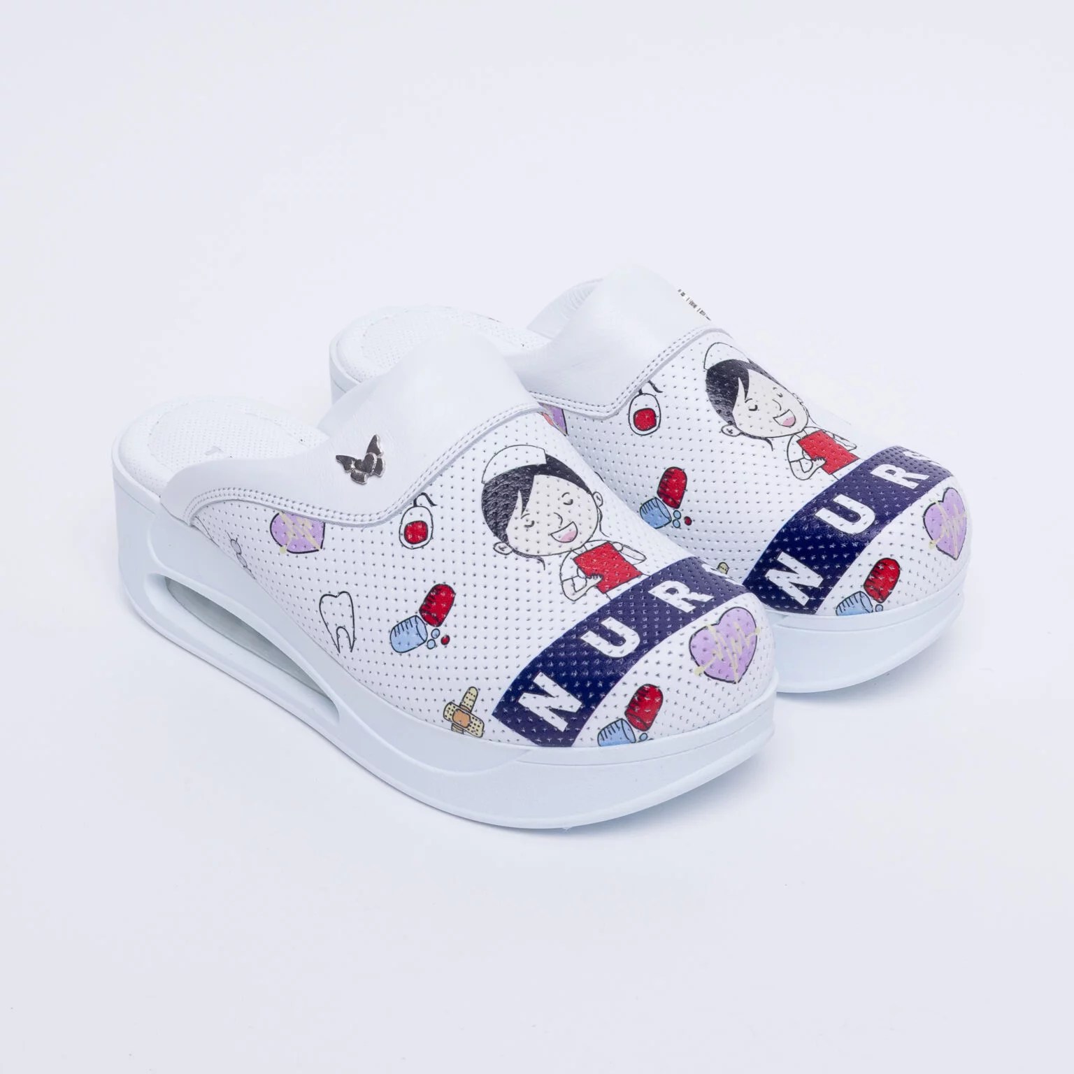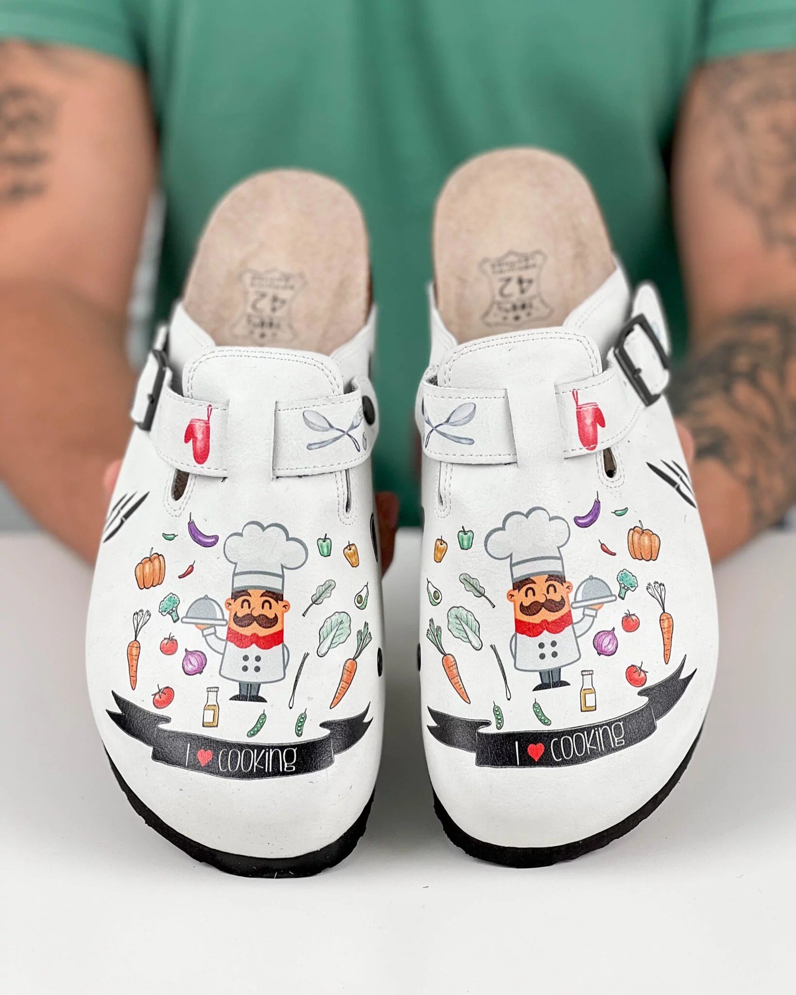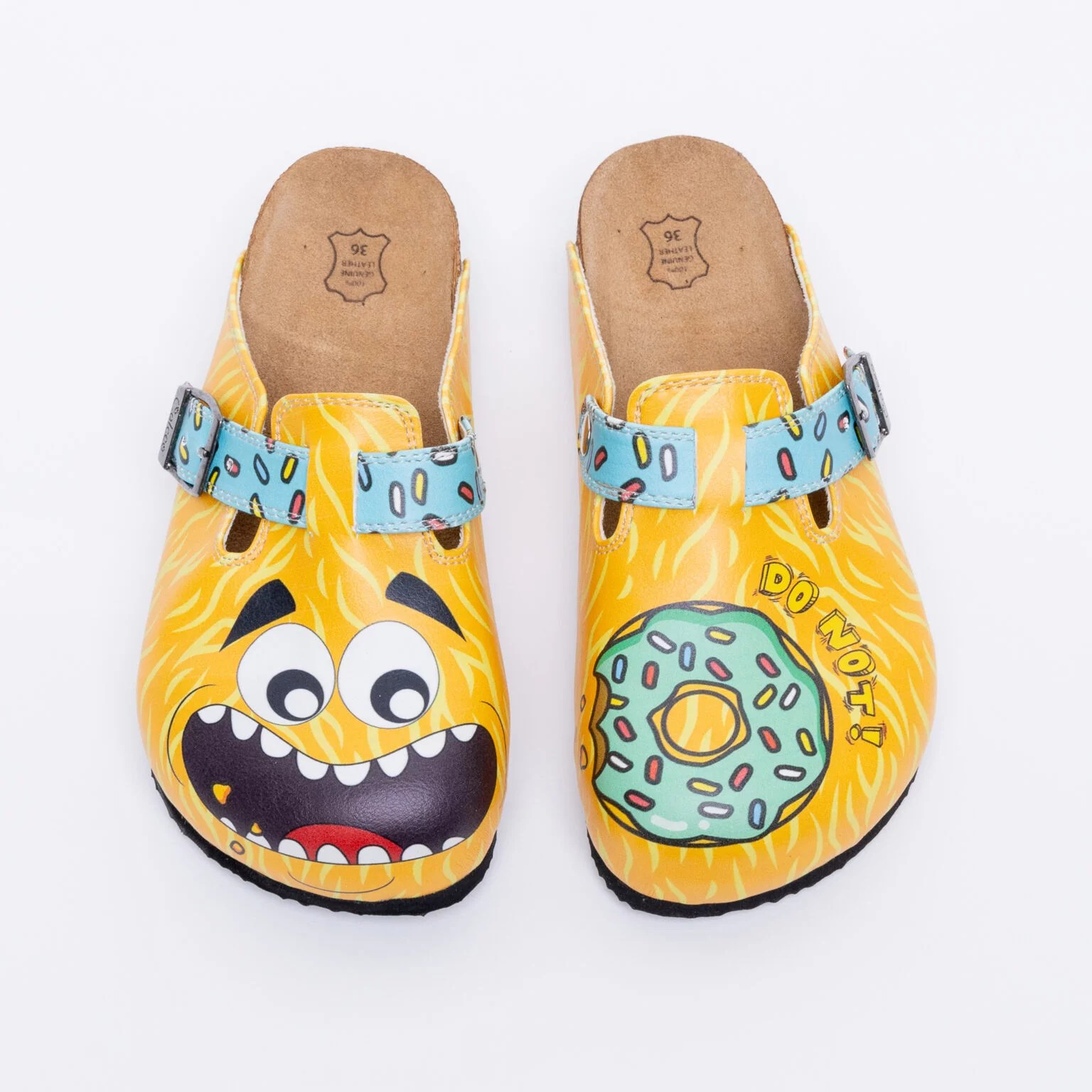 Горната част на чехлите (саята) е изработена от качествена екологична кожа с цел по-наситен печат на картинката, както и от гледна точка на по-голяма хигиеничност, предвид тяхното предназначение. Саята (еко кожа) не попива петна и странични миризми, почиства се много лесно.